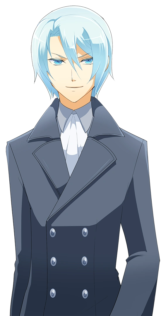 As a human, Sakuya has pale skin and a pair of sharp blue eyes. His hair is short, light blue, with his bangs slicked slightly to the left. His school uniform is much different from other characters due to his extraordinary status as a noble. He wears a white dress shirt, and a coral ribbon around his neck. A greyish-brown double-breasted vest with gold buttons. His coat is light blue, with golden rims. Short around the waist in the front, and knee-length in the back. His dress pants are white, with greyish-brown knee-high boots.